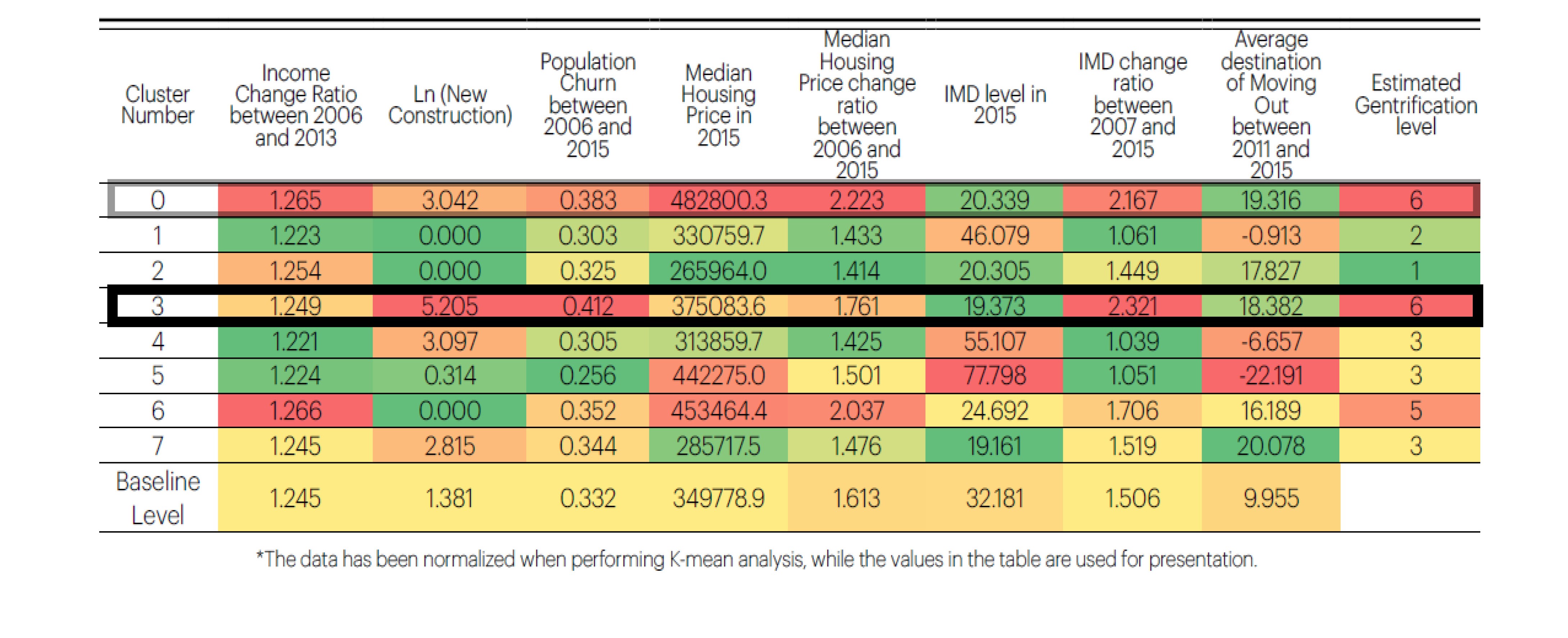 The further K-mean cluster analysis result has divided all the LSOAs in East London according to the level of gentrification indicators. While Cluster 0 is identified with more intensed level of gentrification, Cluster 3 shows higher level of new constructions(labelled as “new-build gentrification”).