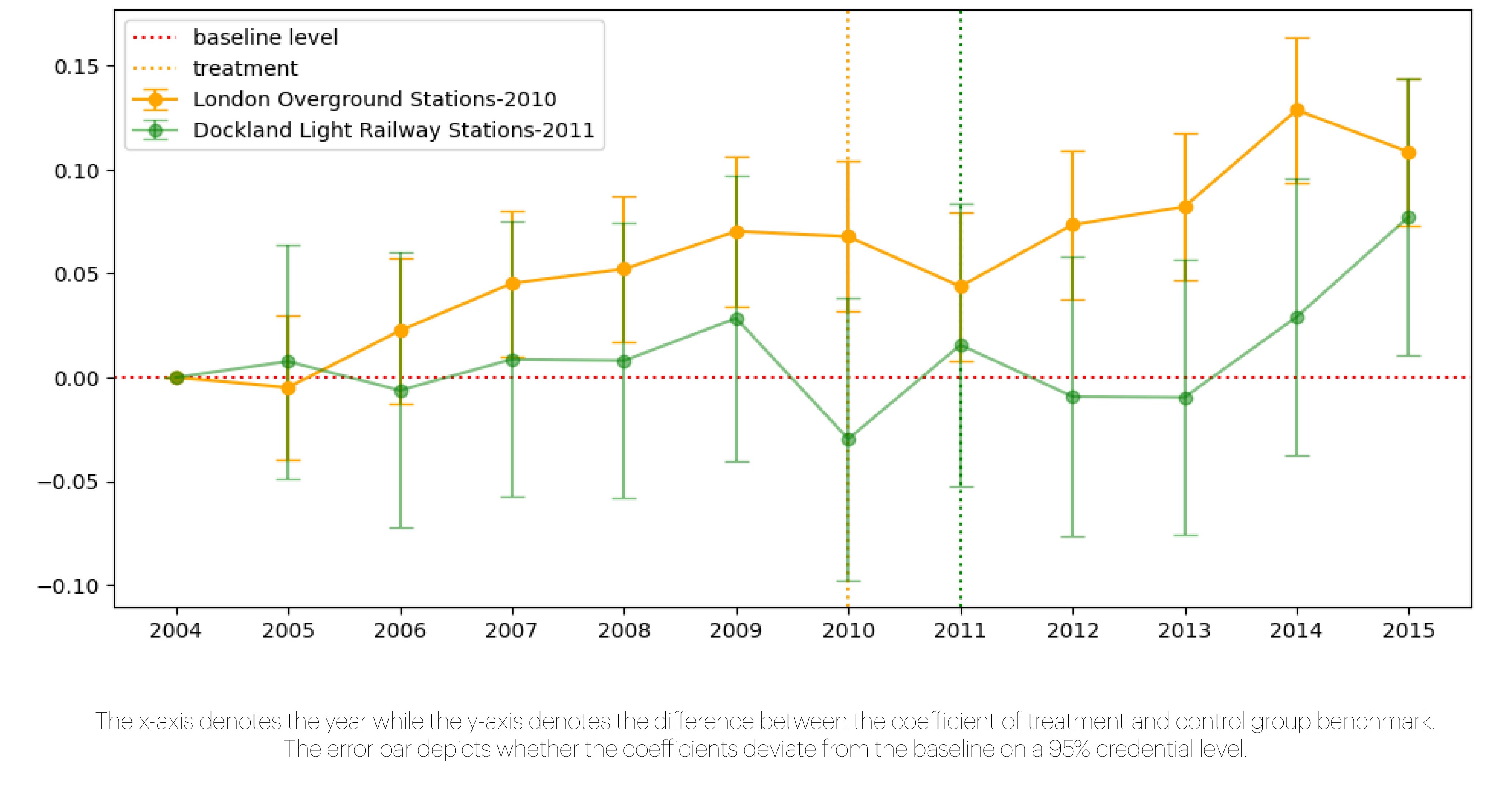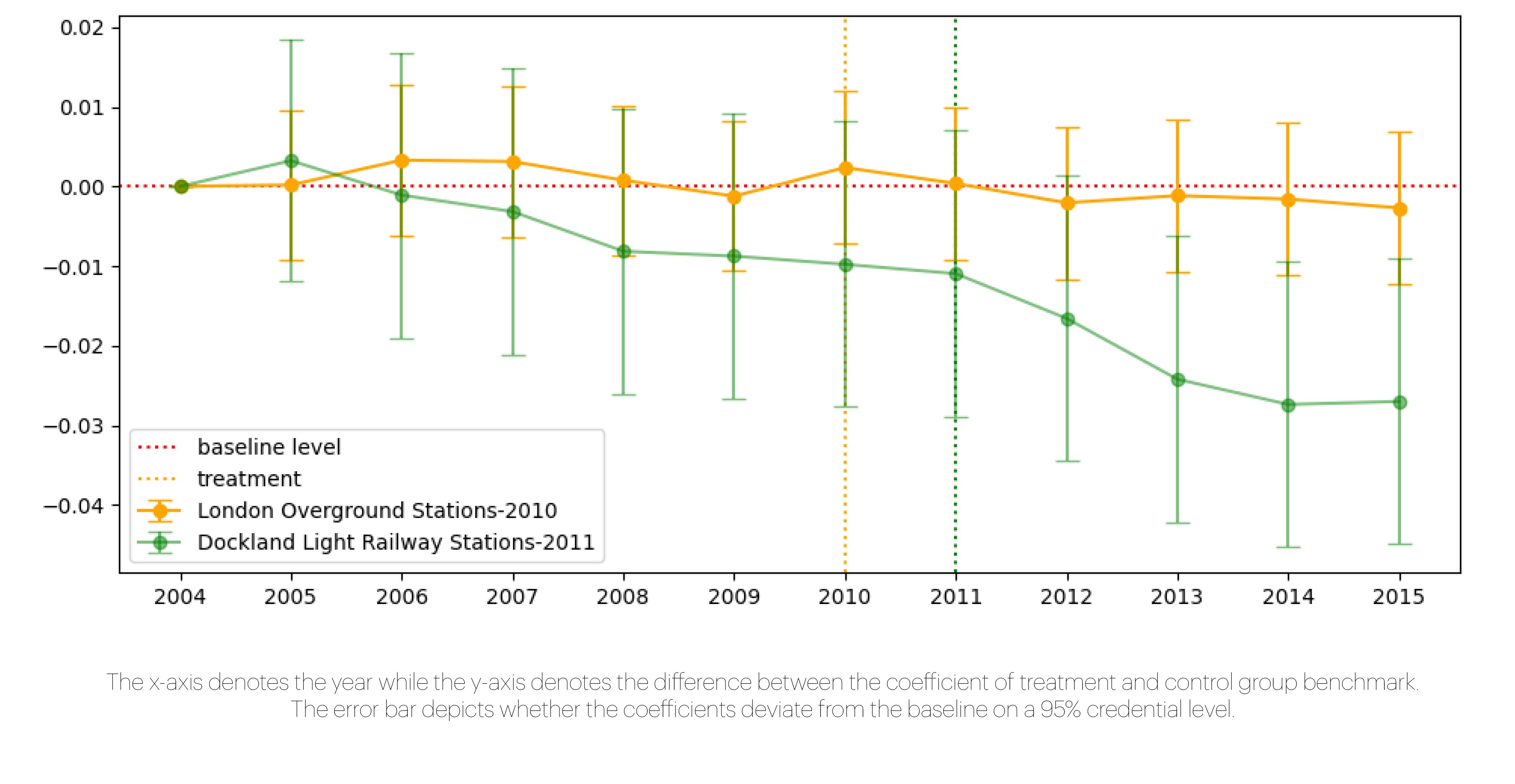 In the analysis of annual impact on the neighbourhoods along these two lines separately, heterogeneity is identified. For instance, housing prices surrounding the London Overground began their ascent after 2006, coinciding with the public announcement of the ‘London Overground’ project. In contrast, the areas around the Dockland Light Railway saw a delayed surge, with prices taking off only after the end of the London Olympic Games. This observation underscores the intricate interplay between transportation development and various policy initiatives, as well as investment activities.