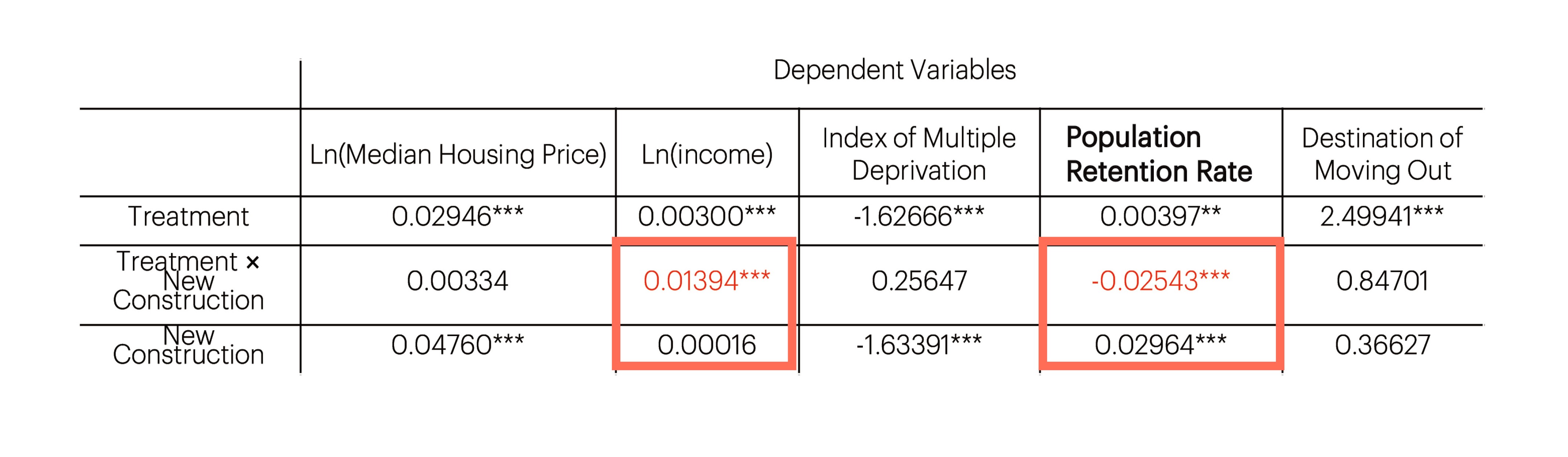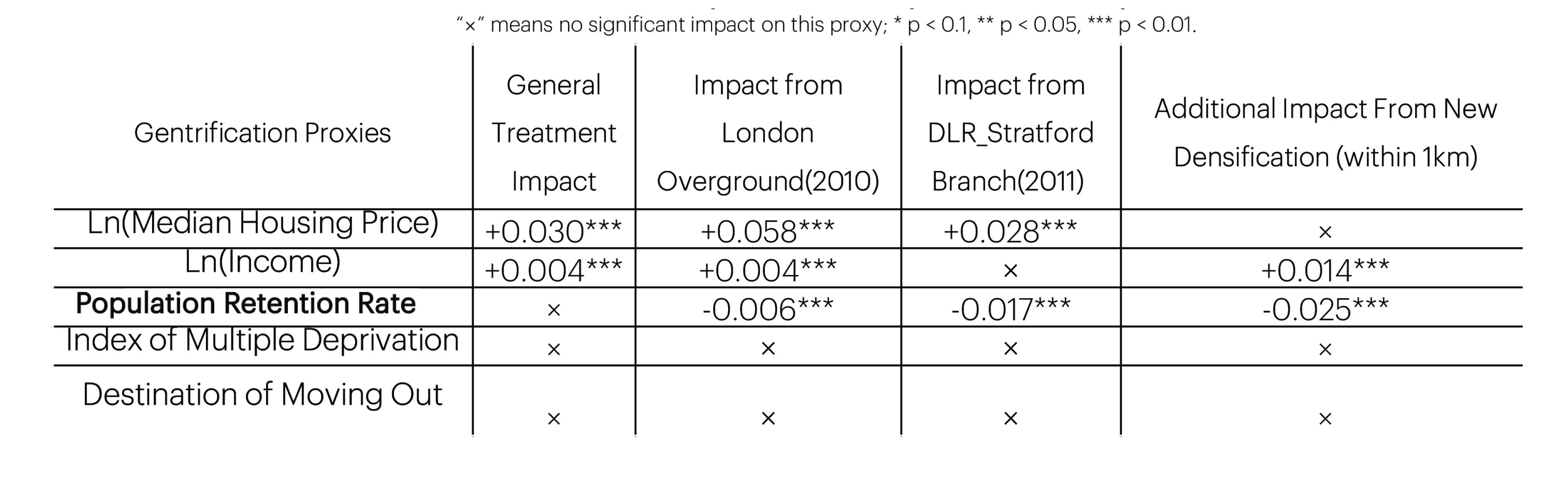 The table above provides insights into the impact of new construction within a 1km radius of the new stations. It highlights a noteworthy trend where such development has resulted in a substantial increase in income, accompanied by a significant drop in the rate of population retention, which has not been observed in other neighbourhoods with new construction. This shows the extention of London Dockland Light Railway and London Overground together with the transit-oriented property development around them is more likely to displace economically disadvantaged residents from their original neighborhoods, adversely affecting their access to the public transport network instead of benefiting them.