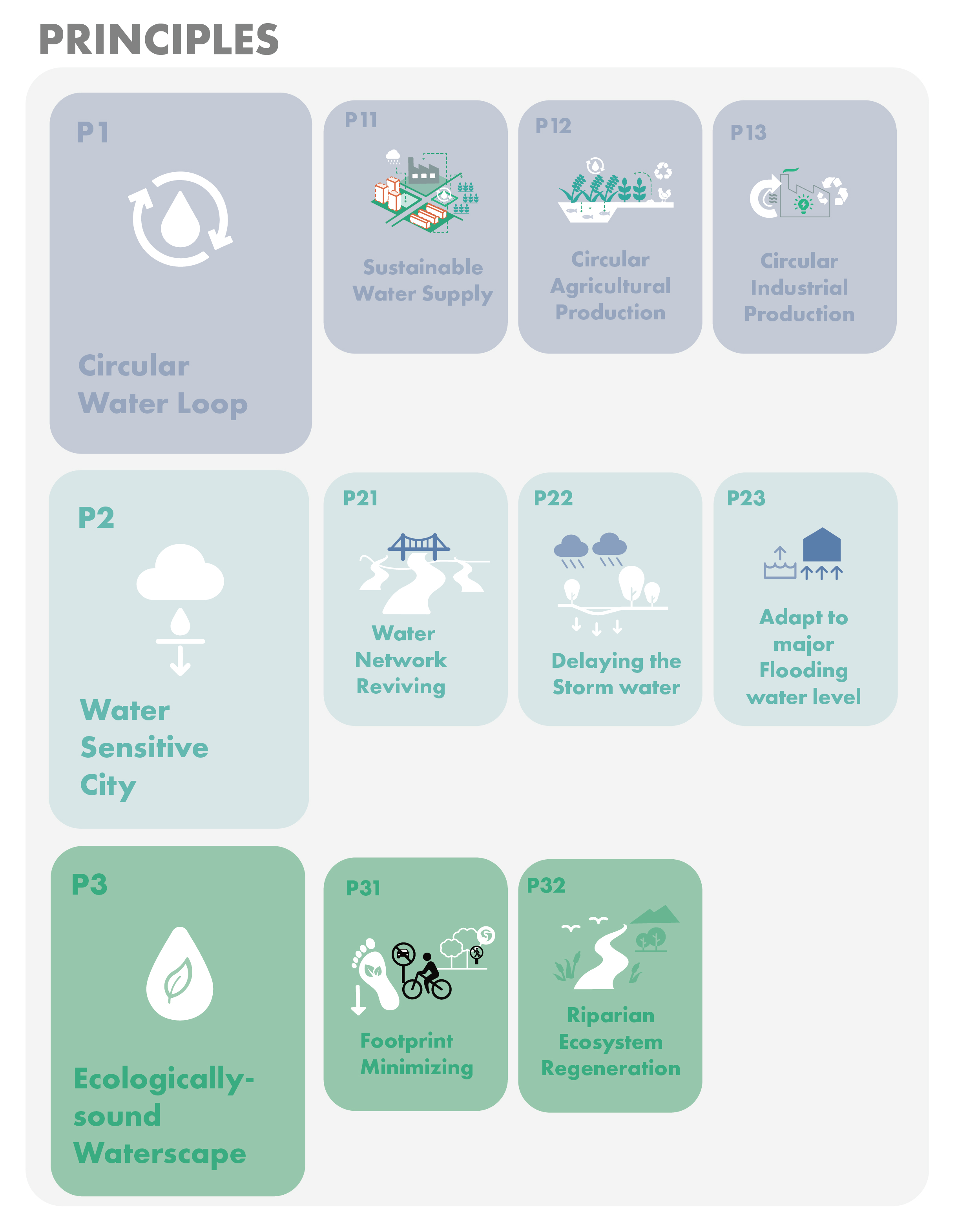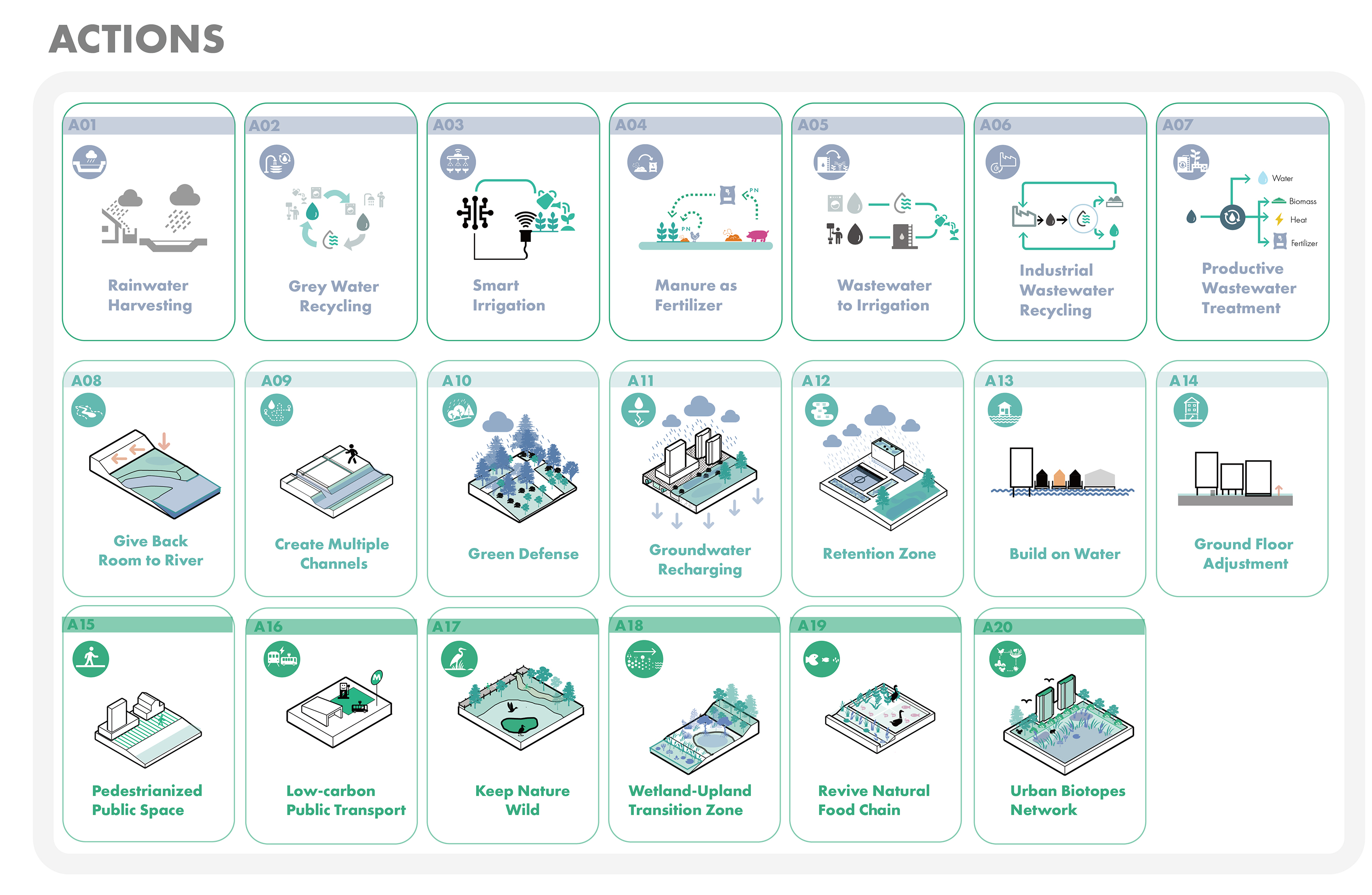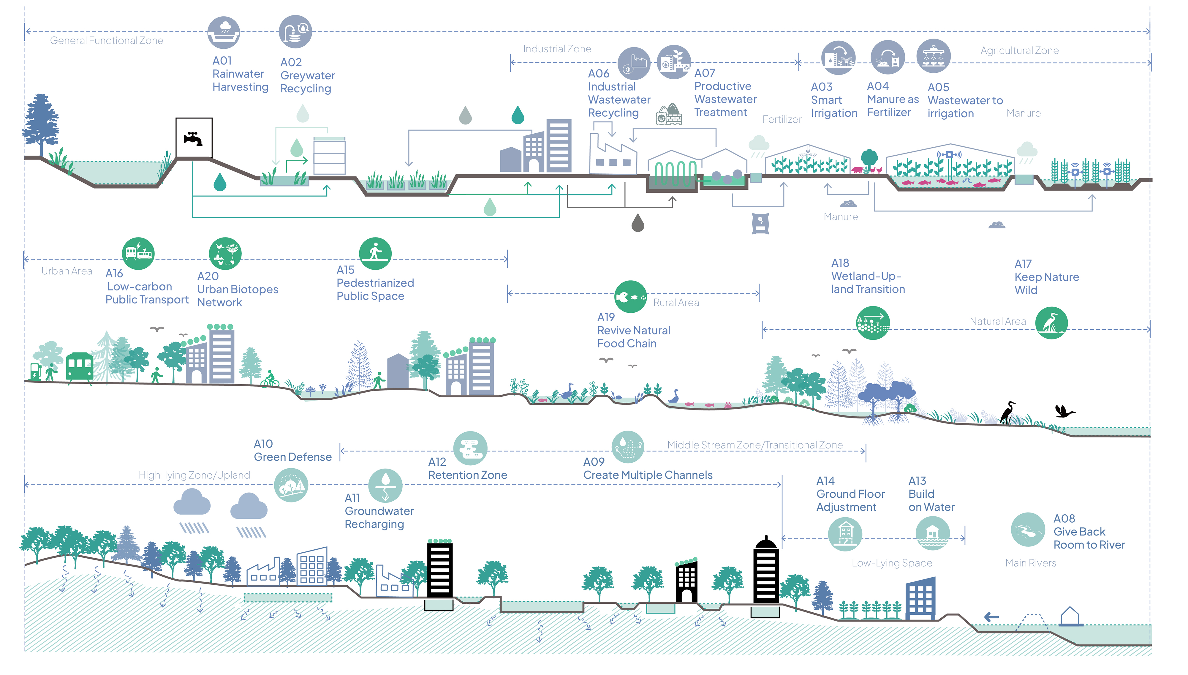 Further implimentation of the patterns can be seen in the pilot project The 2030 Vision for Shangpai Town , where a future water-oriented built environment is imaged on both district-scale and block-scale following a co-creation via this pattern language.