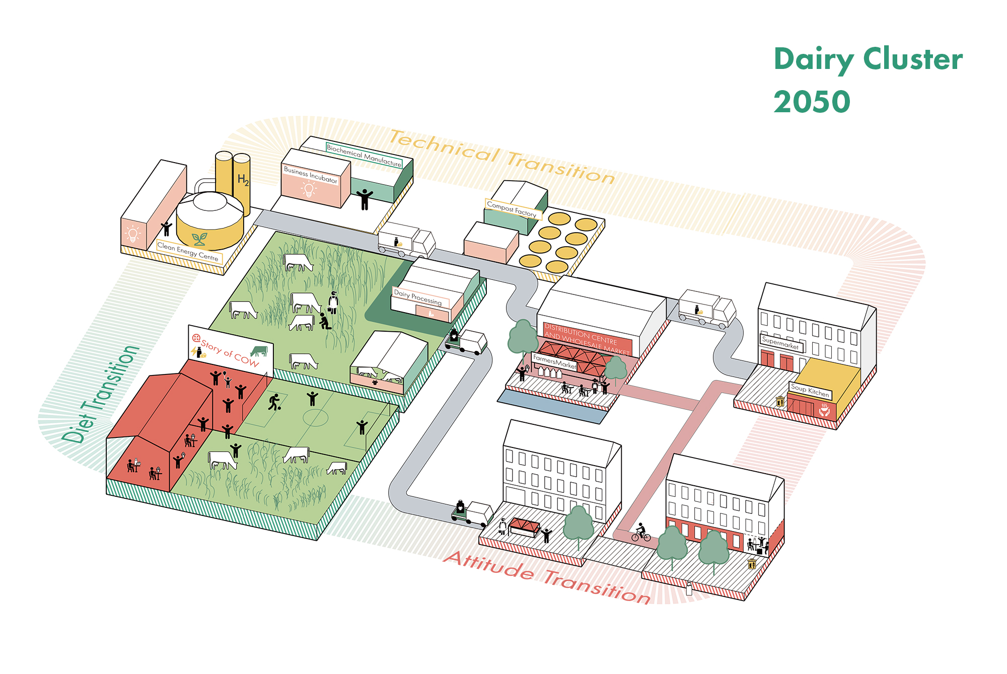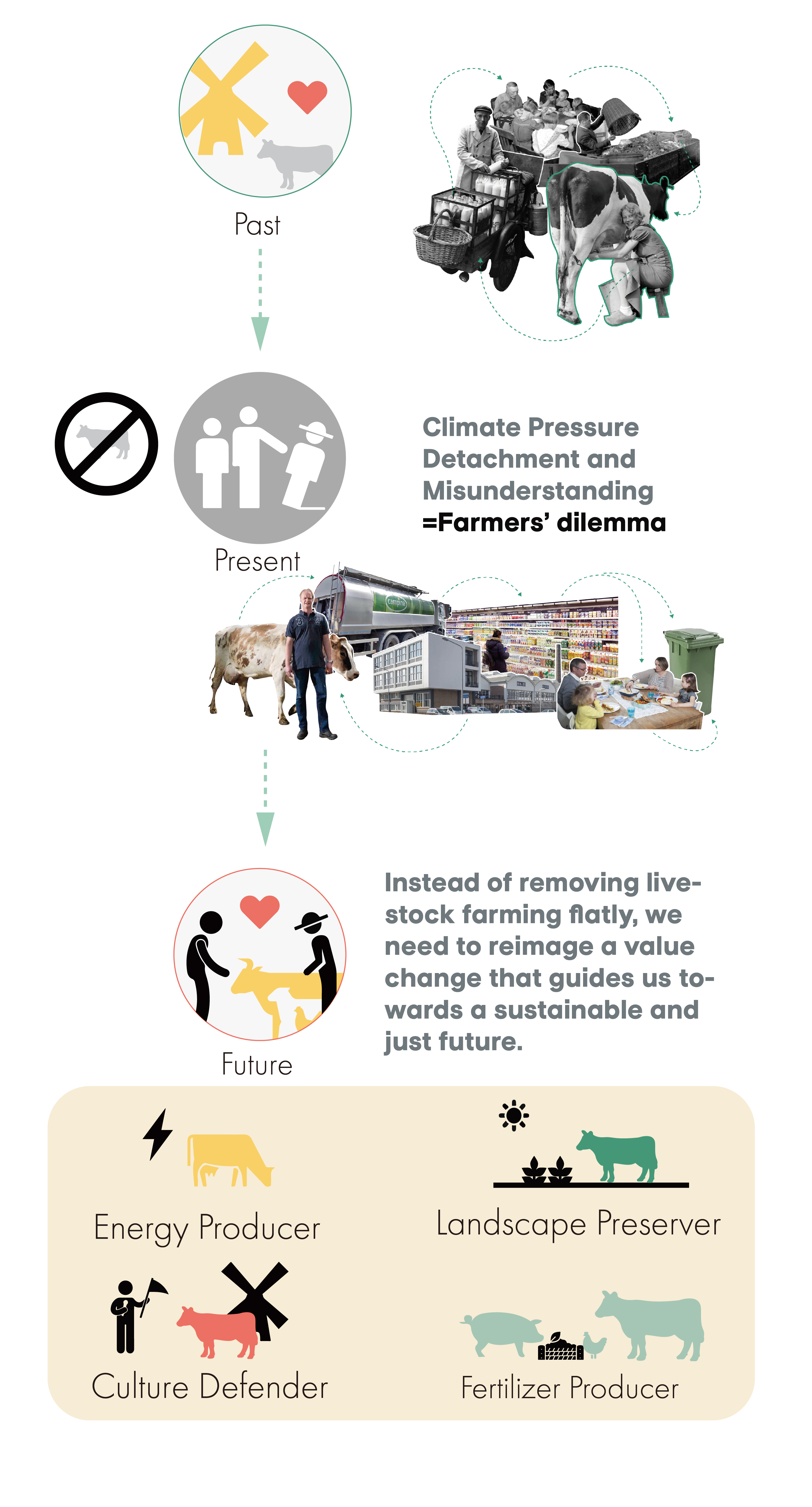 South Holland is the most densely populated area in the Netherlands and has a long tradition of livestock farming due to the peat soil condition. Yet, with the modern segregation between urban areas and their hinterlands, there is increasing detachment between livestock producers and consumers. Meanwhile, the concerns towards the emerging climate issues have even led to growing criticism towards the Dutch livestock sectors. This has brought local dairy farmers into a dilemma, who felt treated injustice, and whose reality is growing ignored by the urban population due to the physical and conceptual disconnect that exists. Being aware of these issues, instead of proposing further blunt and unjust policy, this project aims to reattach importance to the role of livestock farming in South Holland's future and add new value to this sector, and thus to make sure no actors are lagging behind in the sustainable transition.