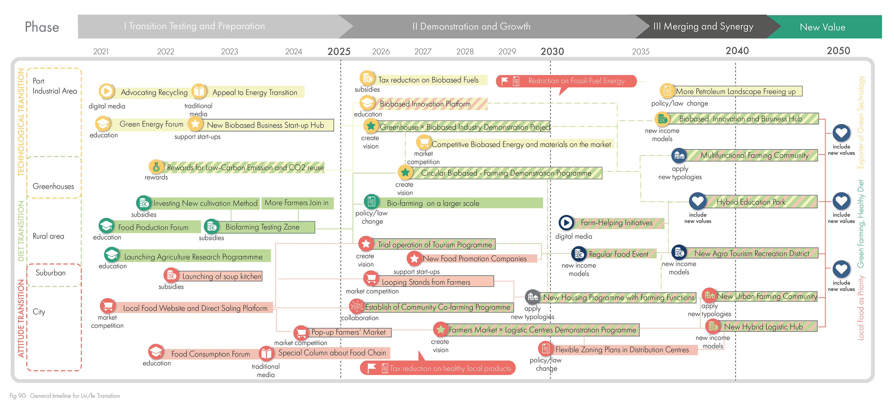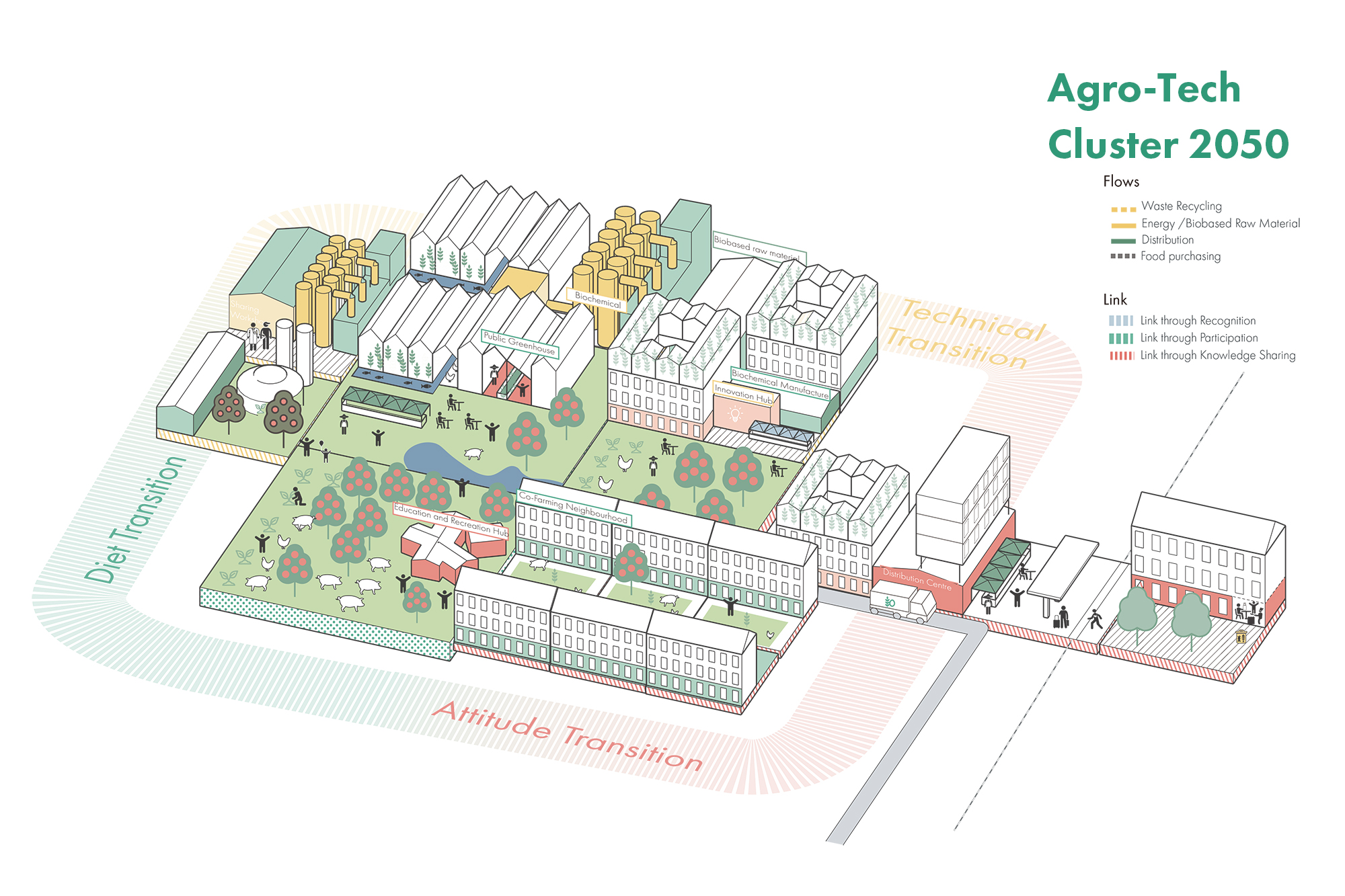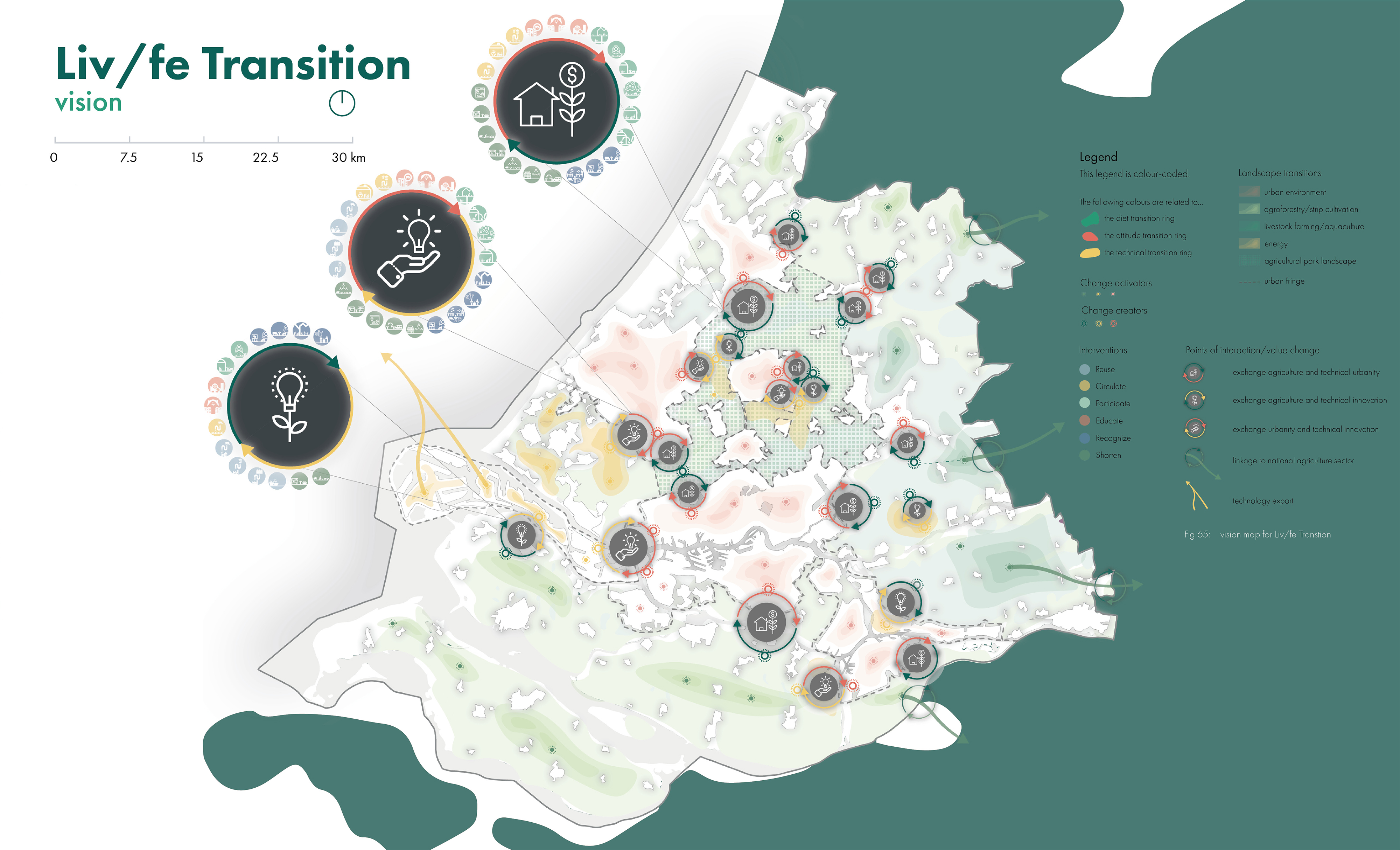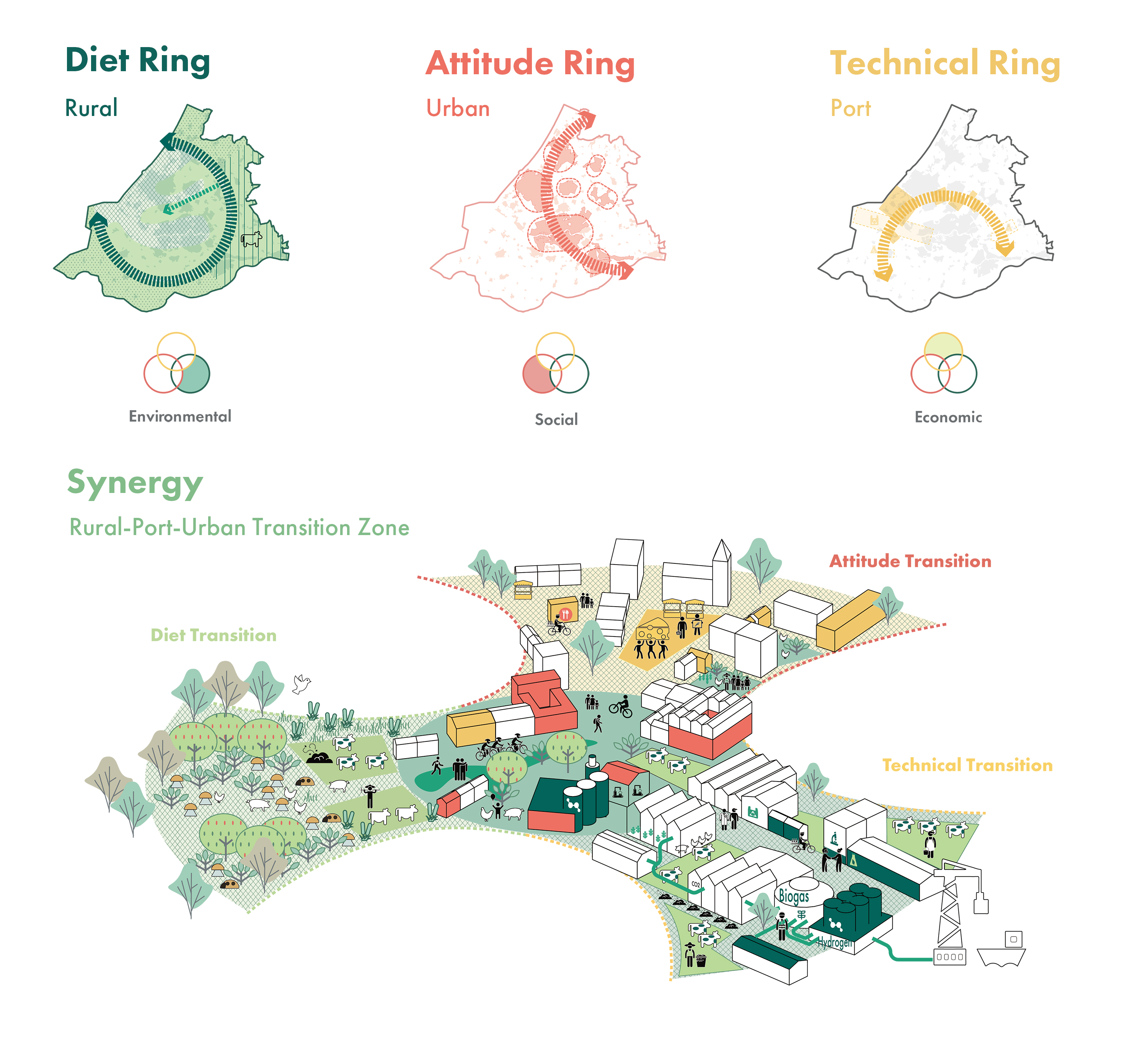 Along with the interventions above, three rings of transition are proposed territorially to accommodate more sustainable ways of consumption and production: