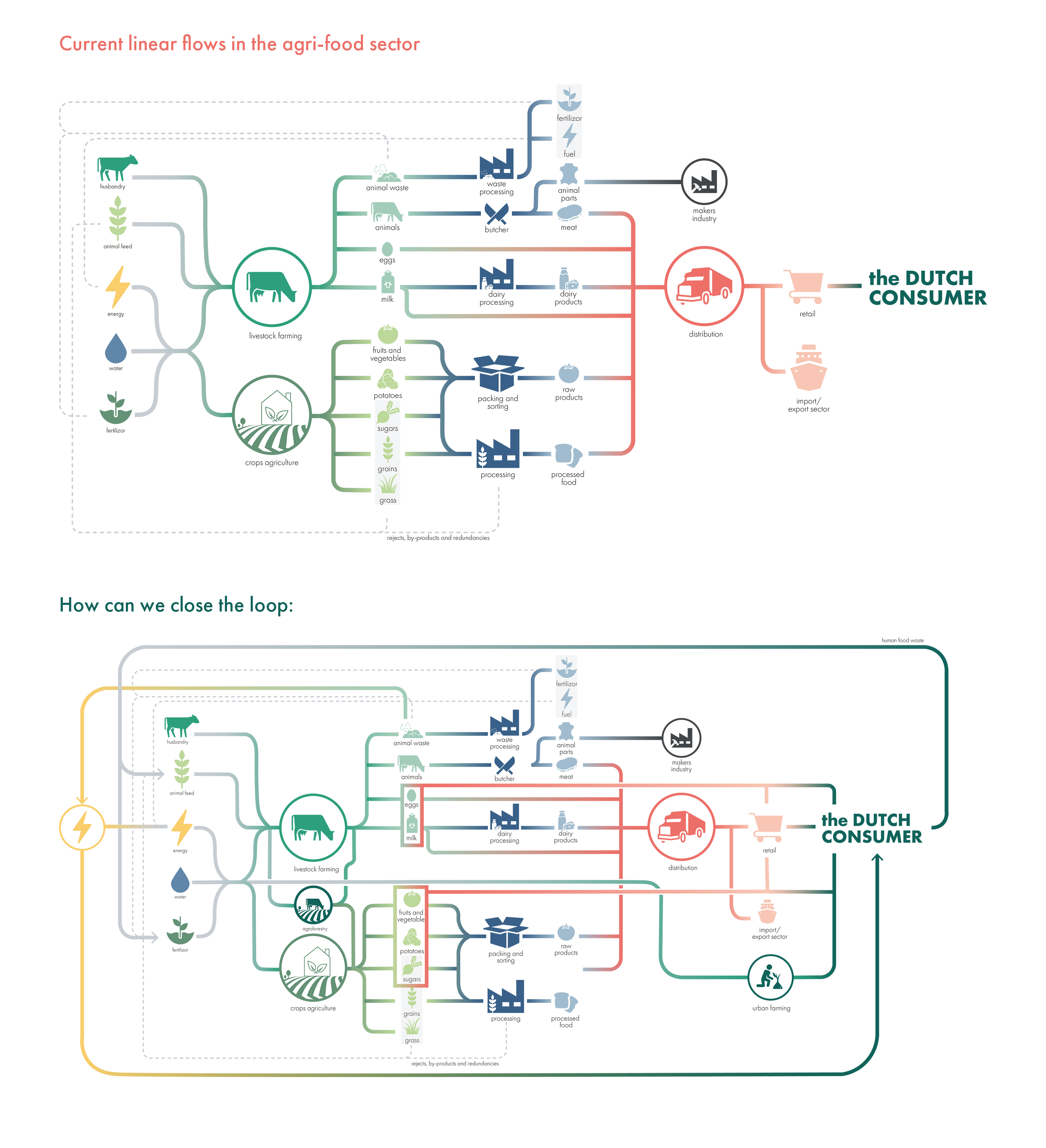 The current chains in the agrifood sectors remain linear. However, there is a large potential for closing the loop, especially if cooperation with the energy sector and waste management sector as well as a collaboration within the agri-food sector is considered. A shorten in the supply chain is also essential, where urban farming and on-site consumption can play a role in further circularity.