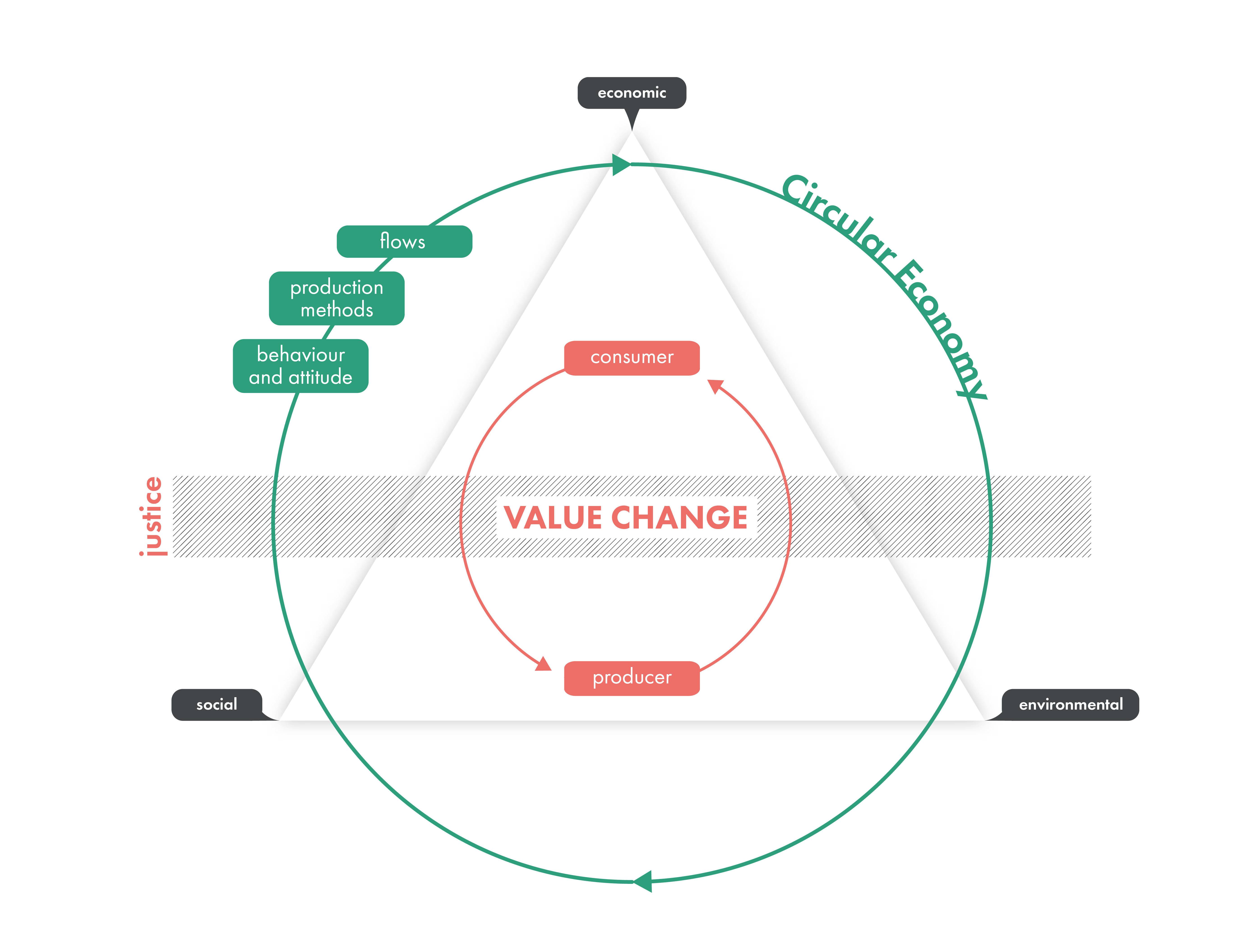 At the core of the project is our proposed concept of “value change”. This value change is driven by the circular economy model and is further based upon the three pillars of sustainability: social, environmental and economic. Through this value change, we want to reshape the relationship between producers and consumers and to achieve justice, both spatial and social.