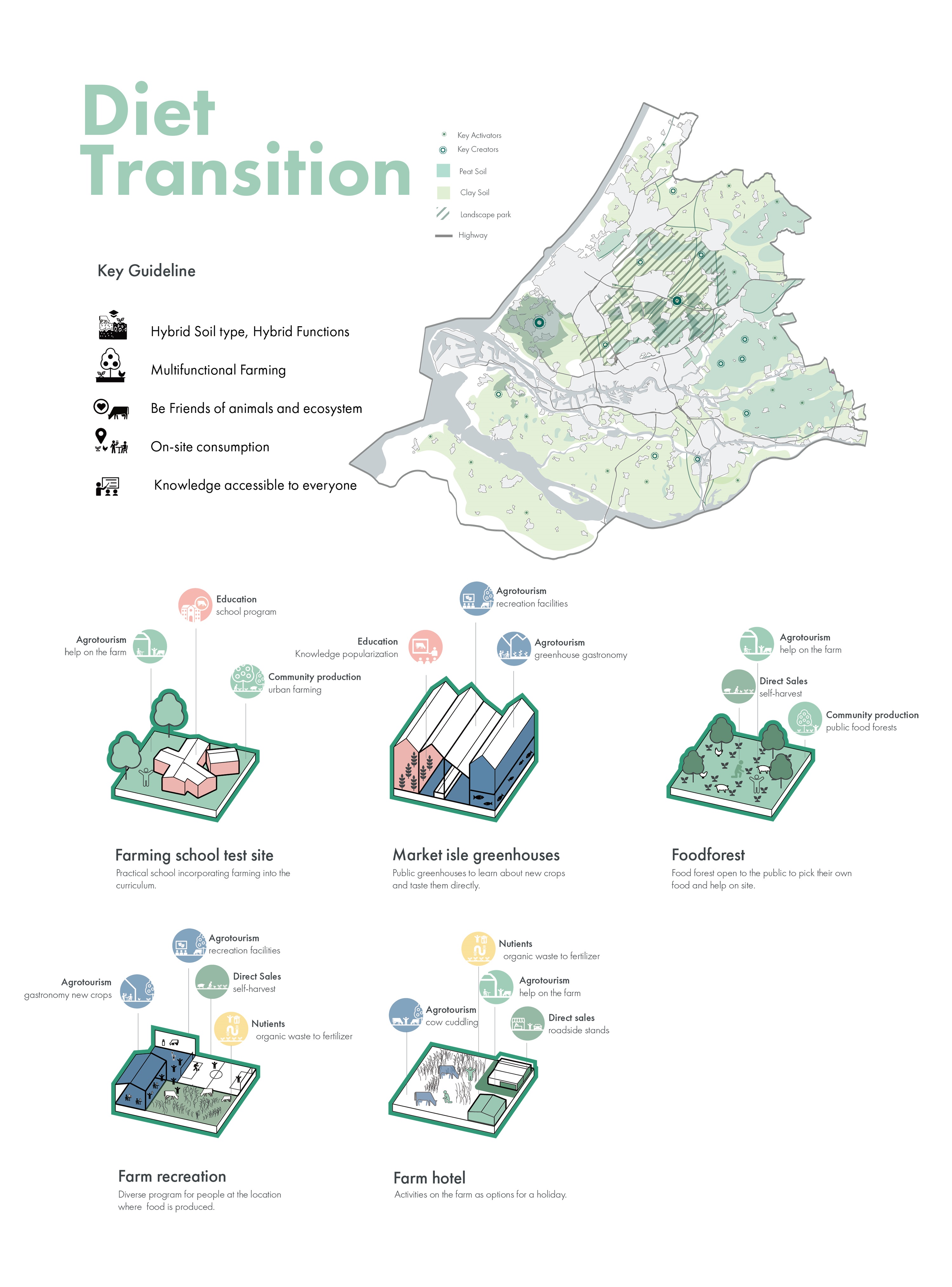 Confronted by both the urgent climate pressure and the growing dairy farmers’ protest events, the agrifood sectors in the South-Holland Province need to be reimagined towards a more sustainable and inclusive future. In our proposed strategy, the livestock farming sector would embrace three types of transition: Diet transition, Attitude Transition and Technical Transition. In this way, it can gradually shift away from being an export-based business towards a more local-oriented, circular and innovative sector, which will re-enter this region’s citizens’ everyday life in a sustainable manner.