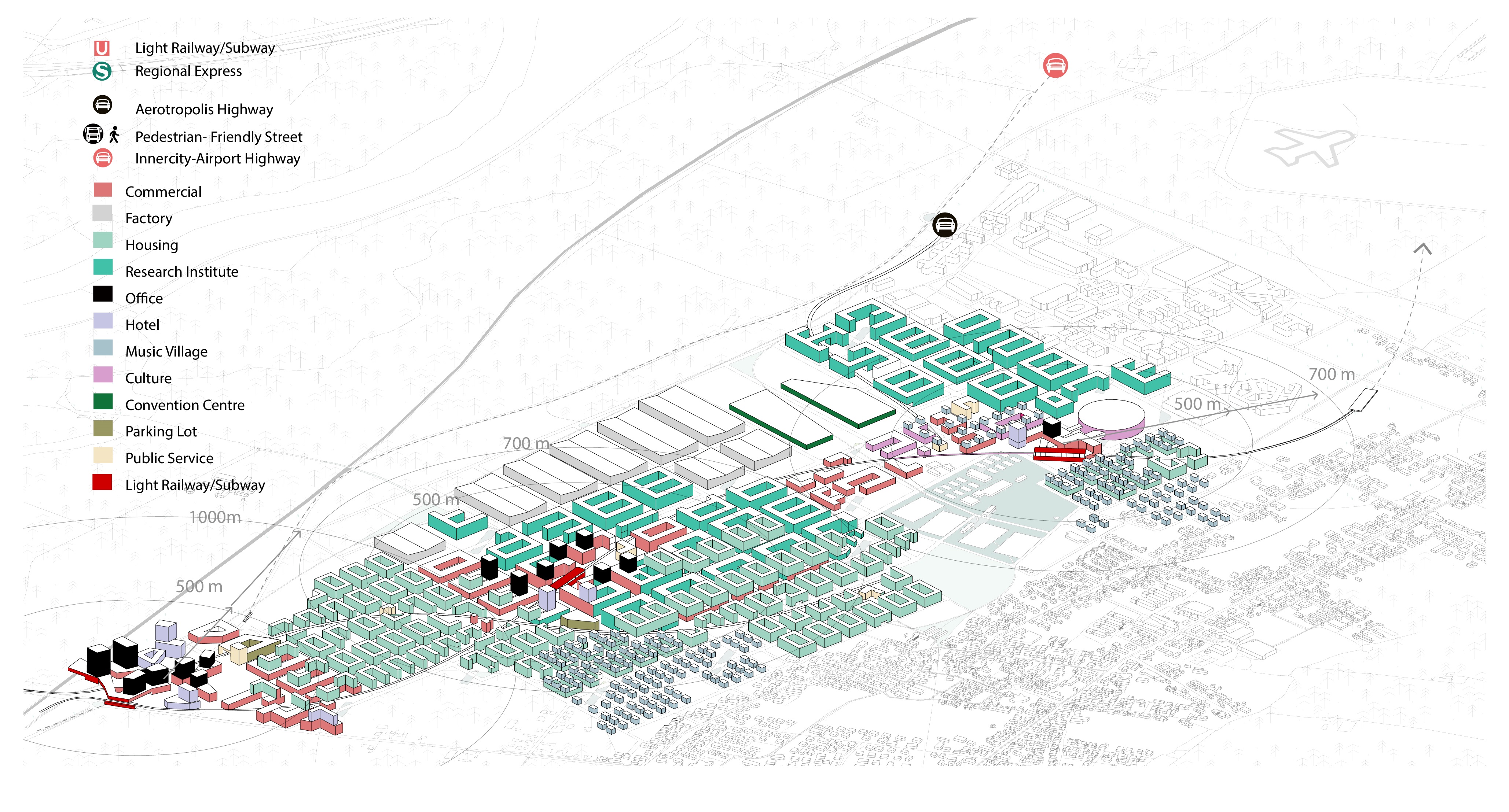 This project served as my experimental exploration of the concept of transit-oriented development back in 2019 when I was an undergraduate student. I was excited about the concept of transit-oriented-development at that time and thought it was the most correct principle for future urban planning. Now, reflecting on it as a postgraduate student with several years of experience, I find myself raising further questions that are not only pertinent to this specific project but also to numerous similar airport city development initiatives worldwide: