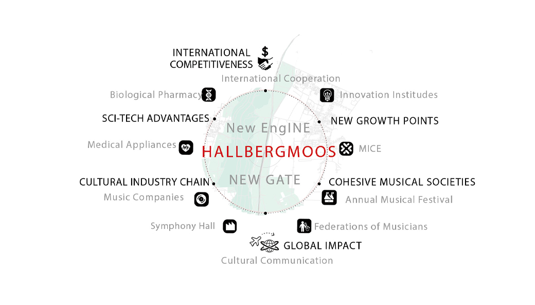 City of Munich vs Port of Munich Although Hallbergmoos is situated outside the administrative boundaries of the city of Munich, it has already become an integral part of the Munich Metropolitan Region owing to its strong connectivity with the Munich International Airport. With the proposed construction of the third runway at Munich Airport, Hallbergmoos is poised to undergo significant transformations. This project explores the potential of Hallbergmoos as an airport city, envisioning its critical role as a new engine and a new gate for Munich in the decades to come.