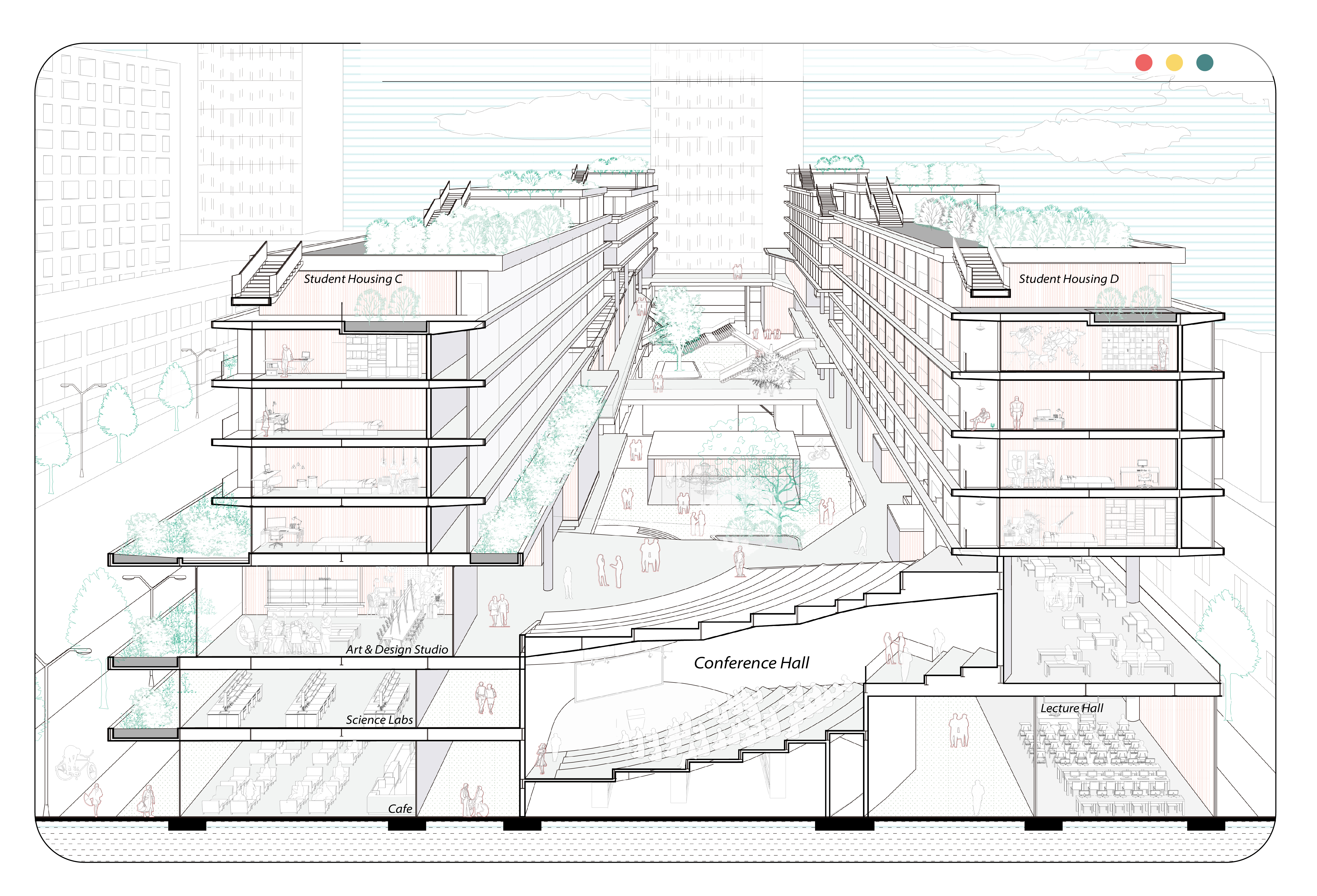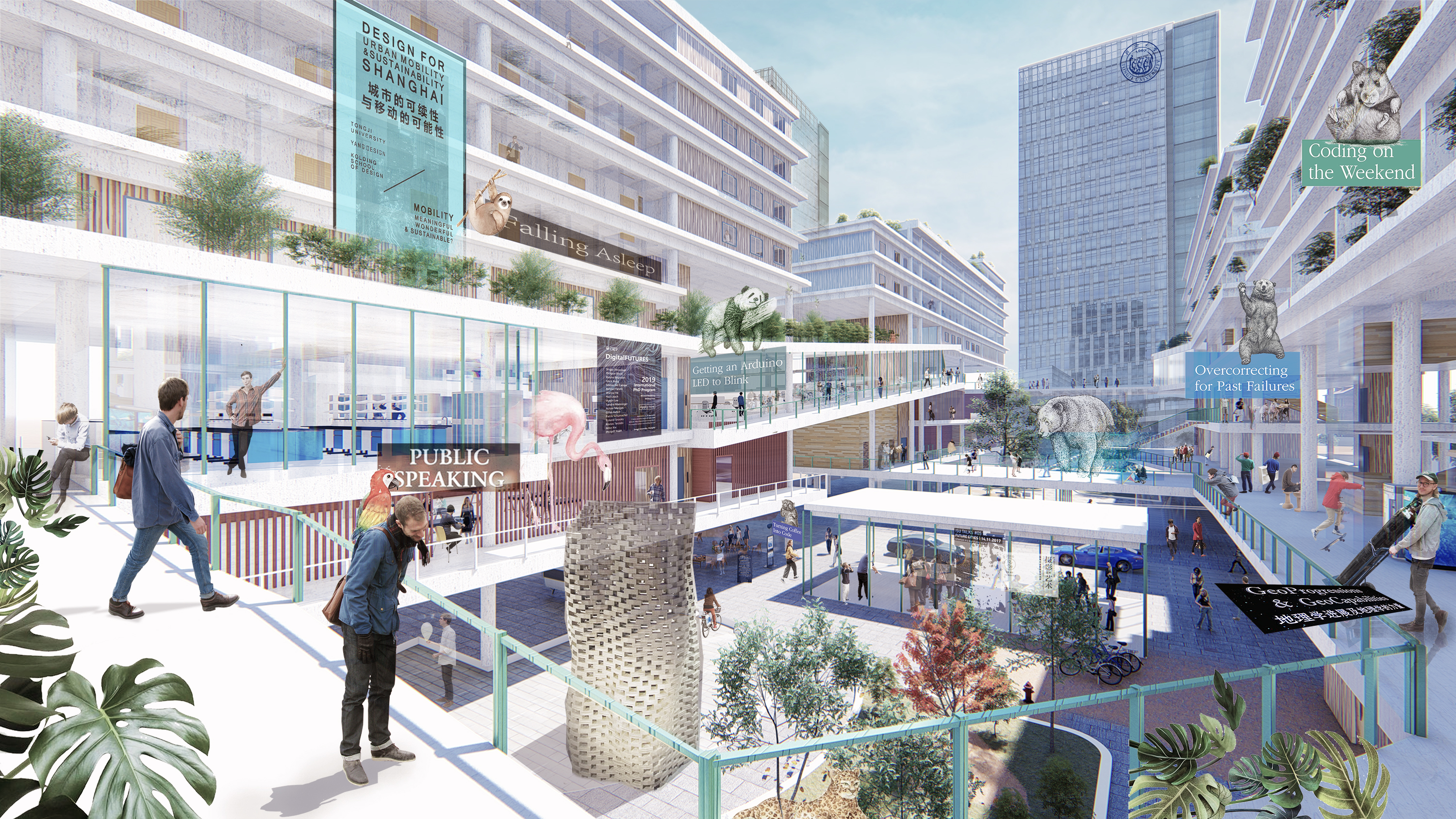 This project proposes the creation of a novel campus building at Tongji University that integrates residential and educational functions. On the lower level of the buildings, not only daily lecturing and dining can be arranged inside the buildings, but also equipped with multiple rooms to cater to the special needs of different departments. Moreover, the upper part of the building is designed for both students and faculty members of tenants of varying ages. By bringing together individuals from diverse backgrounds, the building seeks to foster a vibrant and stimulating atmosphere where they can seamlessly interact and collaborate, fostering the exploration of innovative ideas.